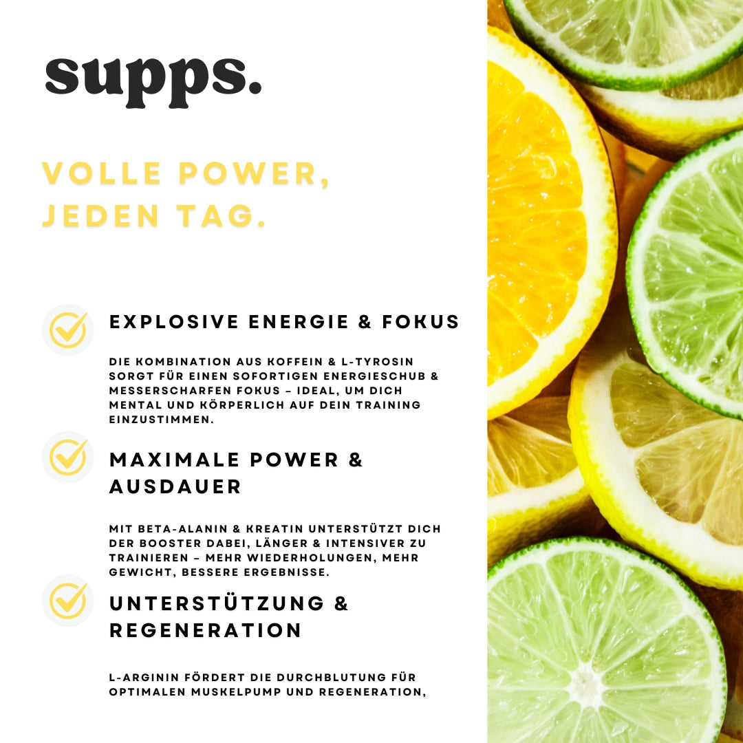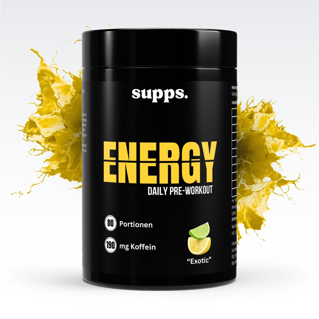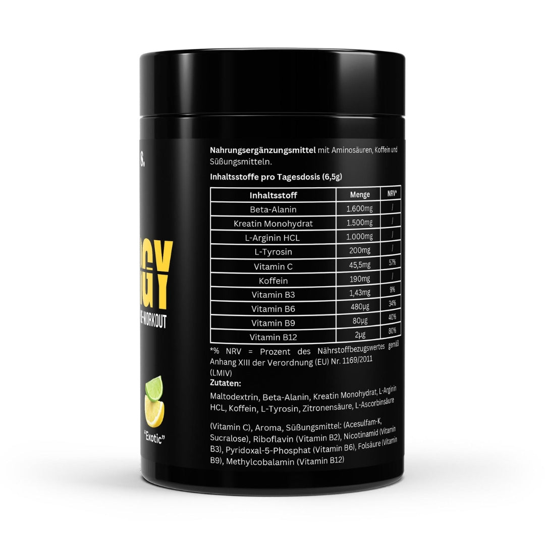 Bring dein Training aufs nächste Level – mit Energy – Pre Workout Exotic. Die kraftvolle Formel mit Koffein, Beta-Alanin, L-Tyrosin, Kreatin und L-Arginin versorgt dich mit konzentrierter Energie, verbessert deine Kraft-Ausdauer-Leistung und unterstützt die Muskelregeneration. Der exotische Fruchtgeschmack sorgt für ein erfrischendes Trinkerlebnis – perfekt für intensive Trainingsphasen.
